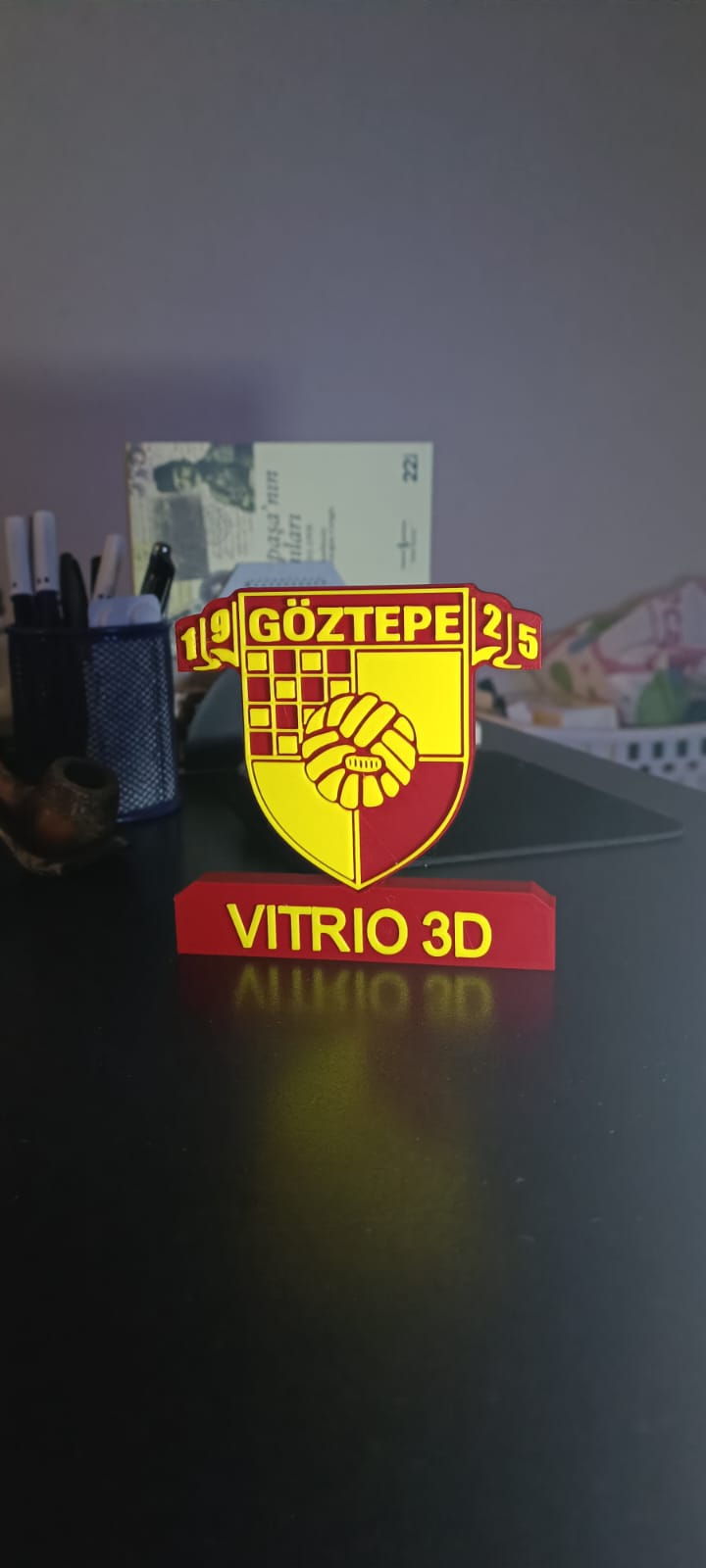 Özel olarak tasarlanmış Göztepe temalı masaüstü 3D logo, isme özel kişiselleştirme seçeneğiyle taraftarlar için eşsiz bir dekor ürünü sunar.